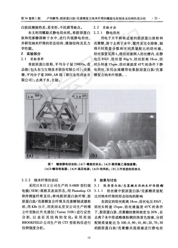 Spiral electrospinning preparation of collagen peptide/oligochitosan composite nanofibers and analys